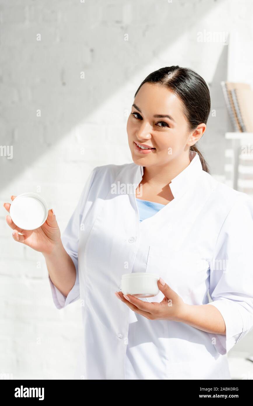 Smiling Dermatologist Holding Cosmetic Cream And Looking At Camera In Clinic Stock Photo Alamy
